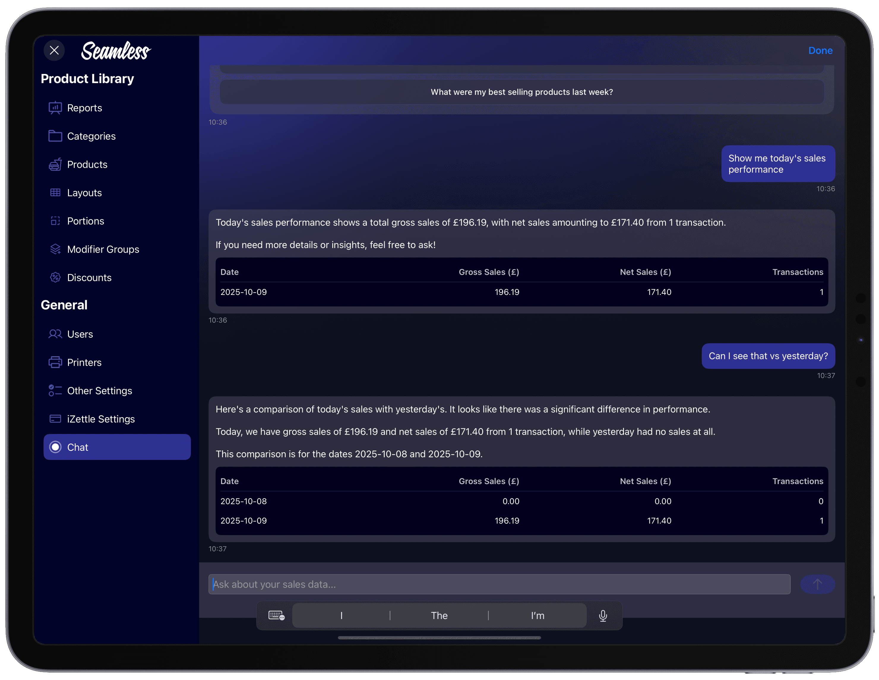 Live data — answers reflect the latest transactions from your Seamless POS.